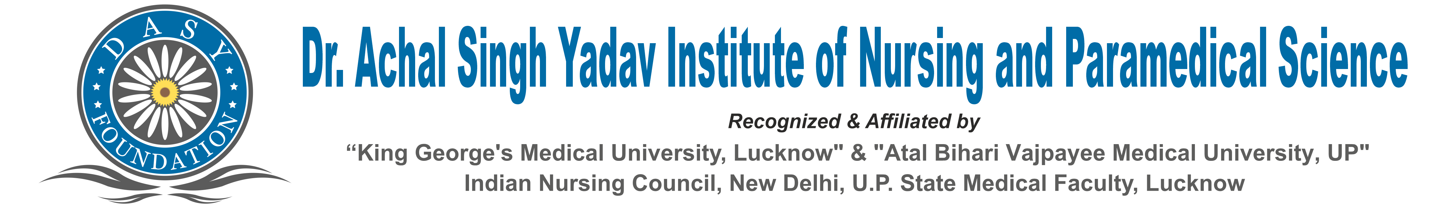 The Dr. Achal Singh Yadav (DASY) Foundation Trust was established in 2013, with the chairmanship of Mrs. Pushpa Yadav by its Chief Founder Trustee Dr. Achal Singh Yadav with spirit that those are blessed who have the opportunity to serve humanity through Medical Profession. The management & staff of DASY Foundation believe that the basic courses in nursing is the formal educational preparation with extensive clinical training in the hospital & communities based on physical, biological & social science. We have responsibilities towards students to develop them as compassionate Nursing Professionals by inculcating the true spirit of education in imparting bookish and practical knowledge, cementing with humanism and patriotism & also an individuals and a good citizen for care of individual & society during illness & wellness.